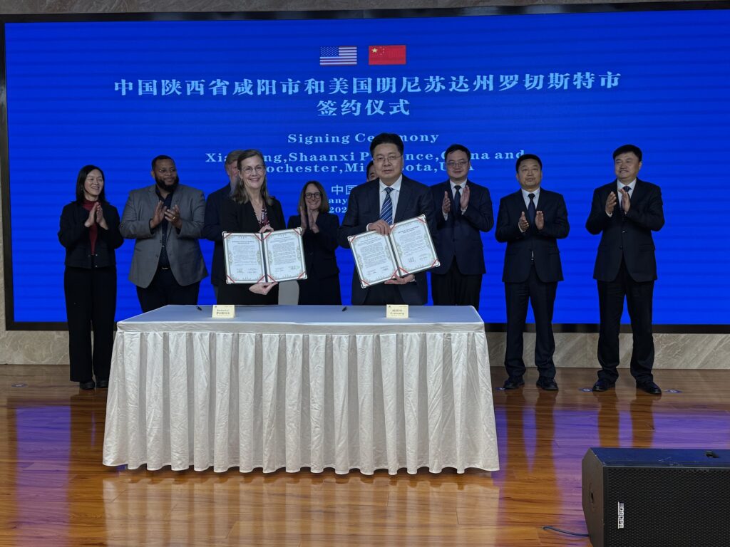 Pictured above: Mayor Kim Norton (left) poses alongside leaders of Rochester’s sister city, Xianyang, after signing a Memorandum of Understanding.