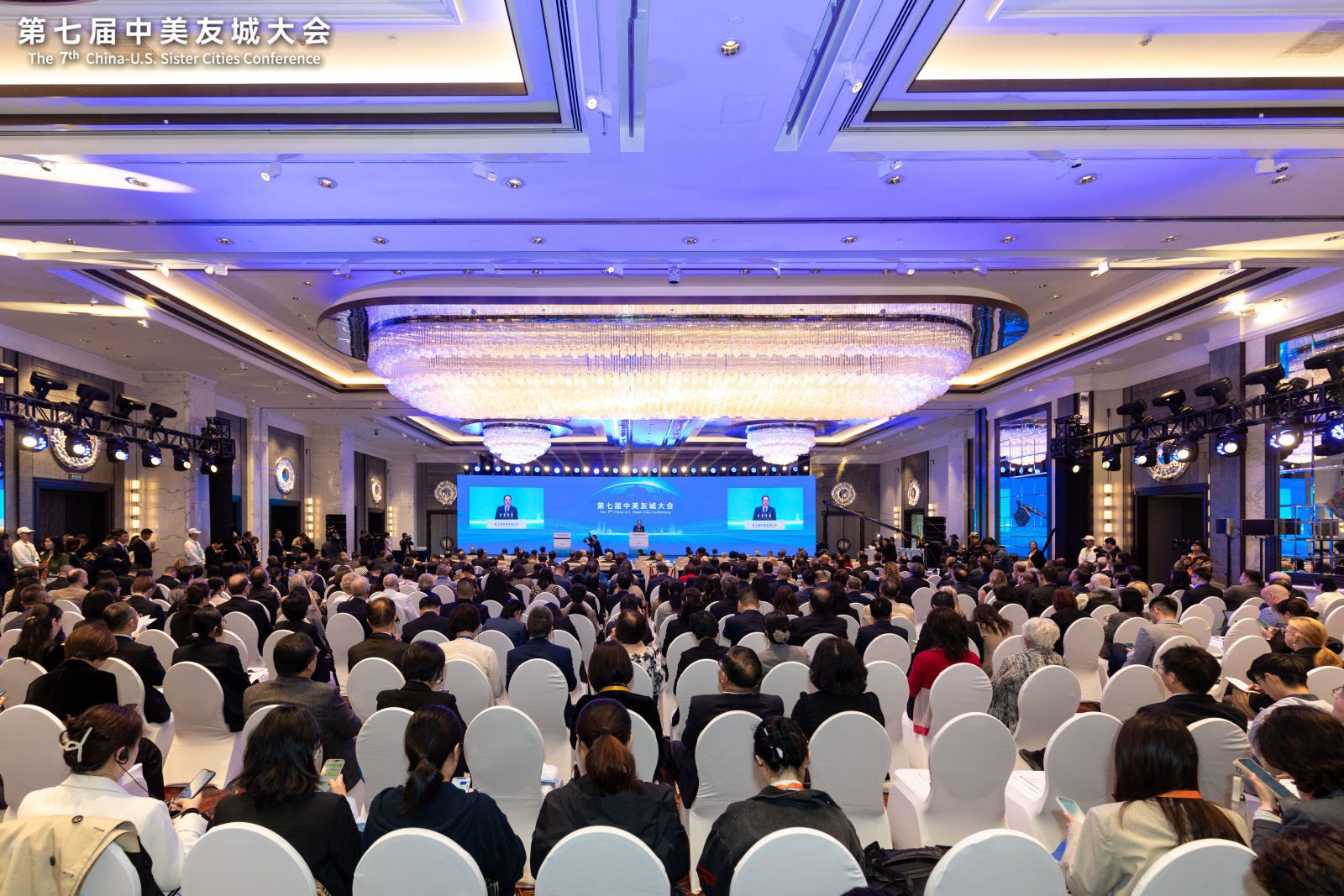 Pictured above from left to right: Audience of the 7th annual China-U.S. Sister Cities Conference; Chinese Ambassador to the United States Xie Feng provides recorded remarks.